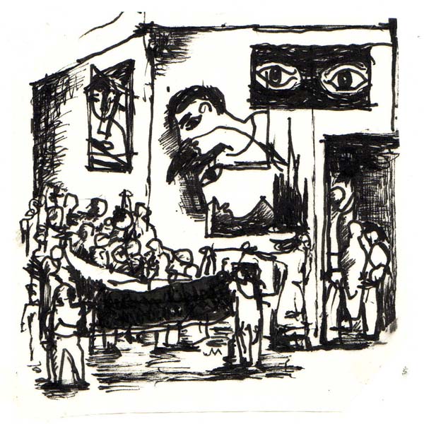 We used the drawing to the right by Julie to protest the bombing of civlians and shelling of Lebanon in the summer of 2006. The invasion of Gaza seems similar though there's no mention [updated January 12th] of white phosphorous or cluster bombs. The issue of genocide remains hidden by the press. The essential crime of bombing / shelling civilians is accomplished now with impunity, as though punishment for war crimes can be parried by deals with guilty politicians of other countries. Part of the tragedy of Israel's crimes is that these seem intended to plant hatred past forgiveness throughout the rest of humanity... - jbg